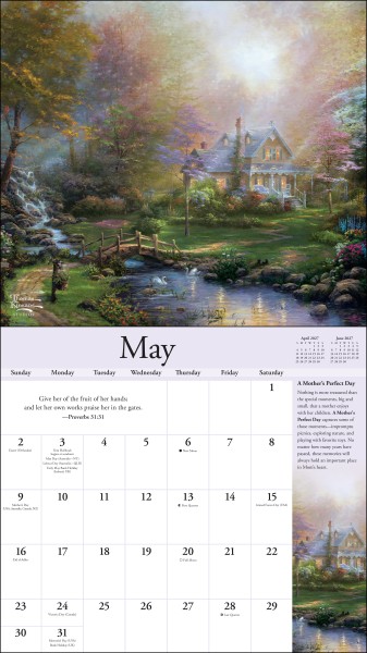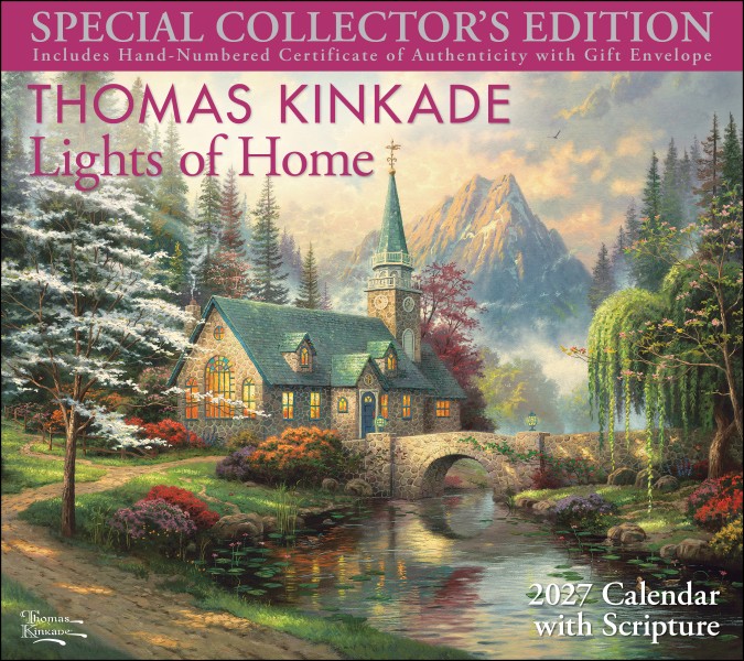 The theme of this year's calendar is Lights of Home, the title of the painting featured on the ready-to-frame print. Each monthly spread of this calendar has a full-color image of a painting such as Peaceful Retreat, Dogwood Chapel, Victorian Autumn, and Mountain Paradise, and includes information about the paintings, Bible verses for reflection or memorization, and plenty of space to add your own special occasions, appointments, and reminders. The calendar comes with a hand-numbered certificate of authenticity and is packaged in a matching envelope with foil lettering, making a lovely gift presentation.