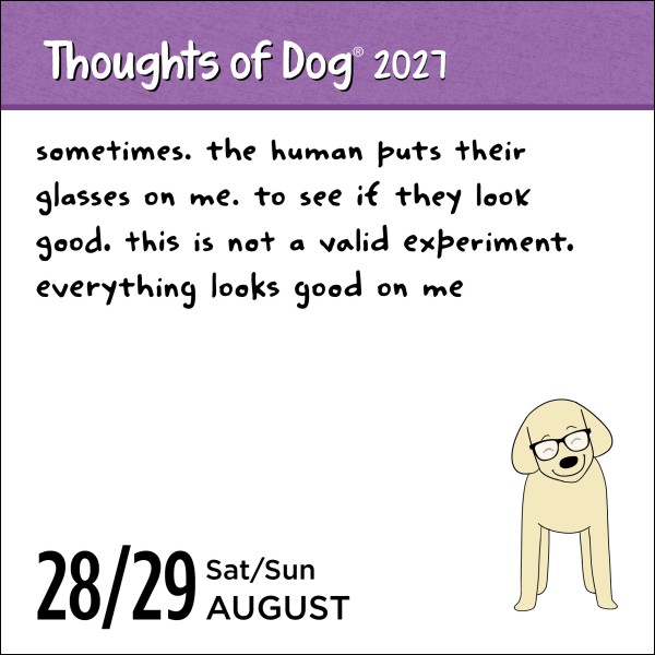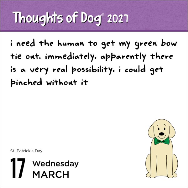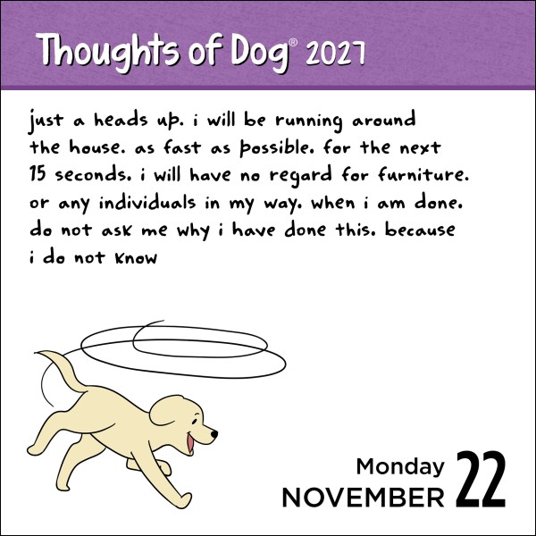 Topics on the dog's mind include frens, snacks, snoozles, the Skittle under the fridge, and––most importantly––all the tireless love and appreciation the dog feels for their human. This daily calendar is the creative work of Matt Nelson, the internet’s dog-humor king.
