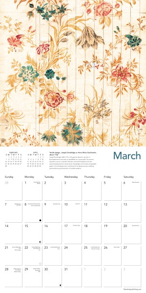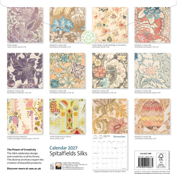 The eighteenth century was a particularly distinctive period in the history of British design, marked by the rise of the Spitalfields silk industry in London’s East End. Anna Maria Garthwaite, James Leman and Joseph Dandridge are among the names closely associated with this period, thanks to the survival of their exquisite watercolour designs now held in the V&A collection. This vibrant selection of patterns illustrates their keen interest in natural forms and exceptional skill in depicting them. Informative text accompanies each work and the datepad features previous and next month’s views. Printed on FSC-certified paper, with plastic-free packaging.