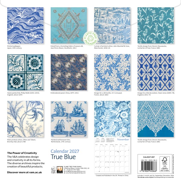 From Islamic tile panels and examples of Chinese ornament, to Japanese furnishings, Nigerian indigo-dyed cloths, and eighteenth century plate-printed cottons, the combination of blue and white hues has been popular across cultures and techniques for centuries. This calendar highlights a selection of objects from the magnificent V&A collections, celebrating this serene and much-loved colour pairing, which forever conveys a sense of high-quality craftsmanship and tradition. Informative text accompanies each work and the datepad features previous and next month’s views. Printed on FSC-certified paper, with plastic-free packaging.